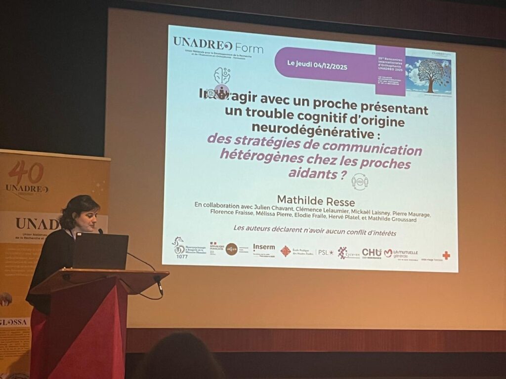 Dans le cadre des 25èmes Rencontres internationales d’orthophonie UNADREO, Mathilde Resse, orthophoniste et doctorante au sein de notre laboratoire, a eu l’opportunité de présenter les travaux menés autour de la communication au sein de la dyade aidant-aidé.